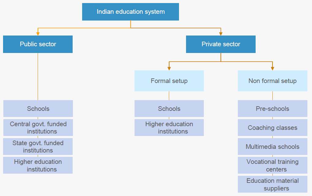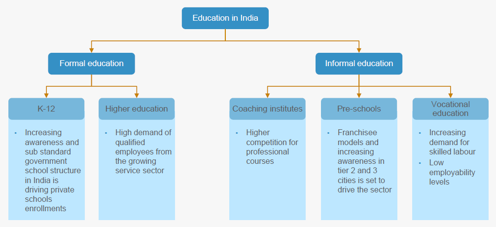 The sector is mainly divided into Formal and Informal Education, further segregated to Pre-Schools, K-12, Higher Education, Vocational Education and Private Coaching Institutions. Taking a deep dive into our education system we can find both the formal and informal structure for the Private Sector.